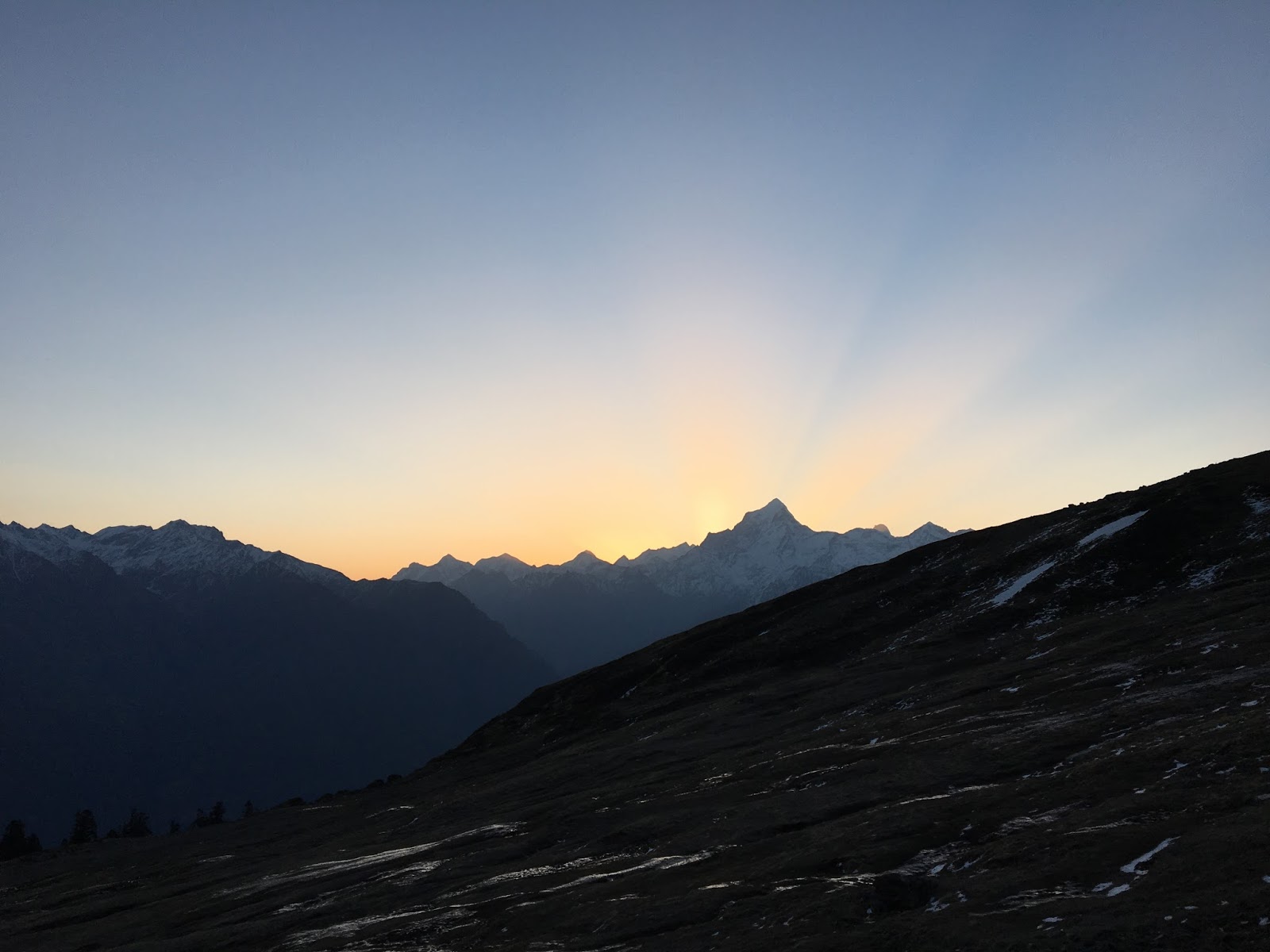 A poor night’s sleep for all those going on the trek. We were up at 3:00 a.m for some hot breakfast and tea. We set off at 4 a.m, in the dark. It was quite an experience, walking uphill in the cold and the dark as we made our way through on some stones and a meadow to reach our first halt at about 5:30 a.m. At this point, 8 of the 20 in the group decided to take up an offer to go and visit Kuari Pass, which was a much easier trek compared to scaling Pangarchulla. At this point, I decided to leave my head torch (a bulky and powerful one) underneath some stones, to be picked up on the way back. Then, we set off onwards towards Pangarchulla.
